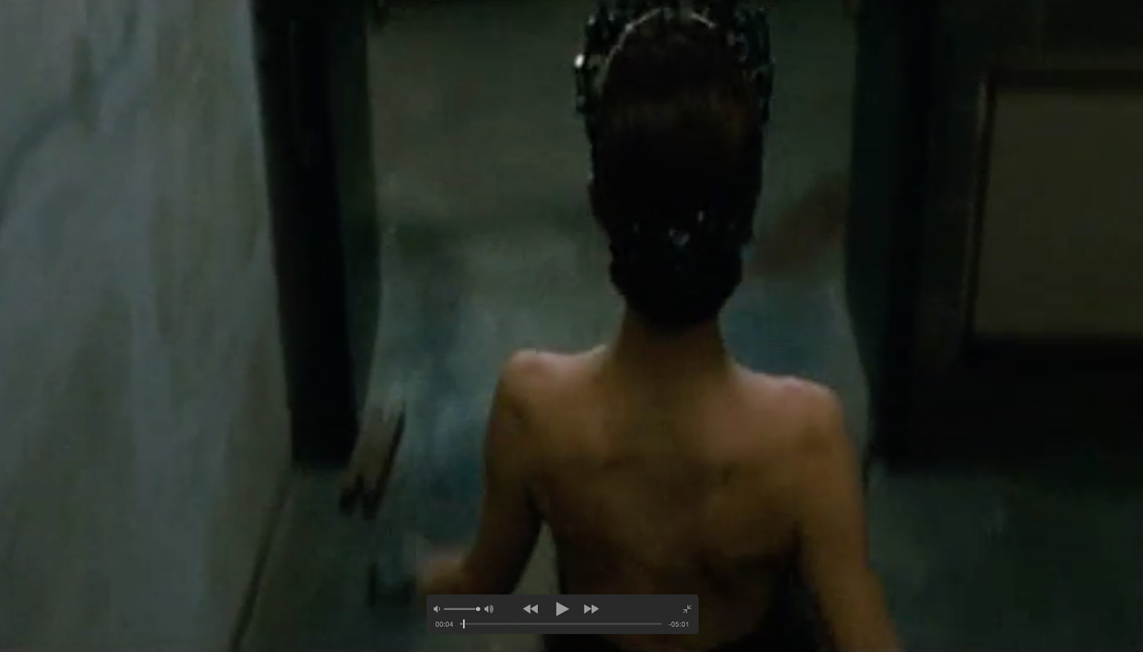 The camera tracks every movement she makes, copying her pace and emotions. If she's rushed the musics rushed and the pace of the camera movement is rushed, if she's stressed the music copies the emotion and if she's sad the music becomes sad and the pace of camera movement becomes slow. She takes a towel from a high shelf and places it in the pool of blood to clear it up.